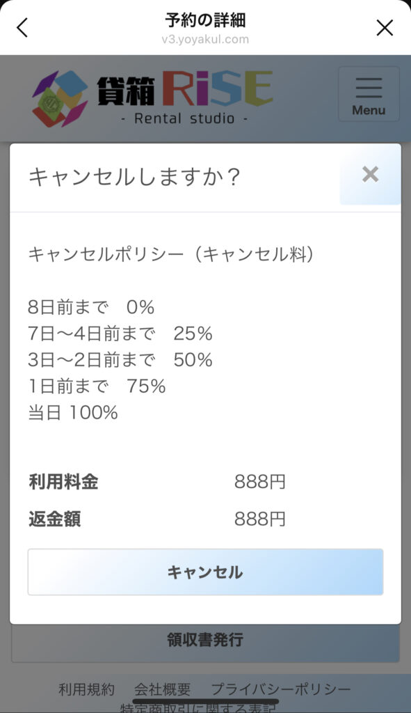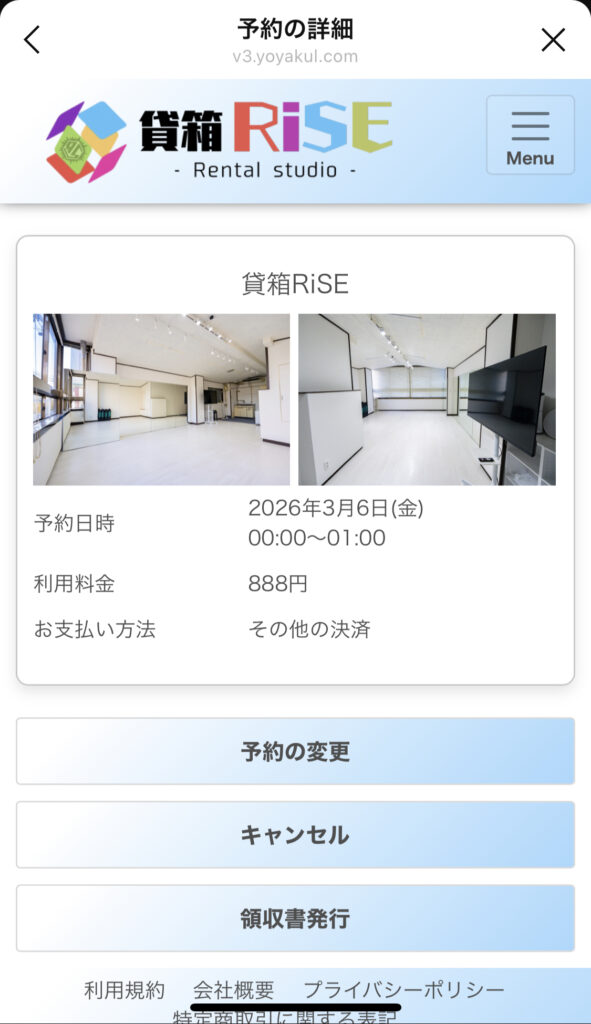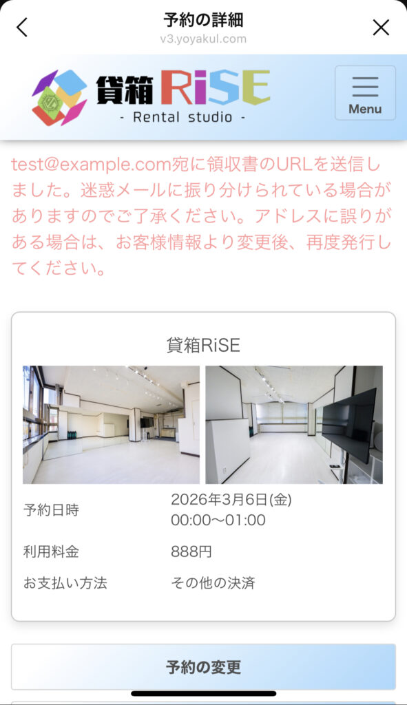 予約完了後、領収書を発行する事ができます。